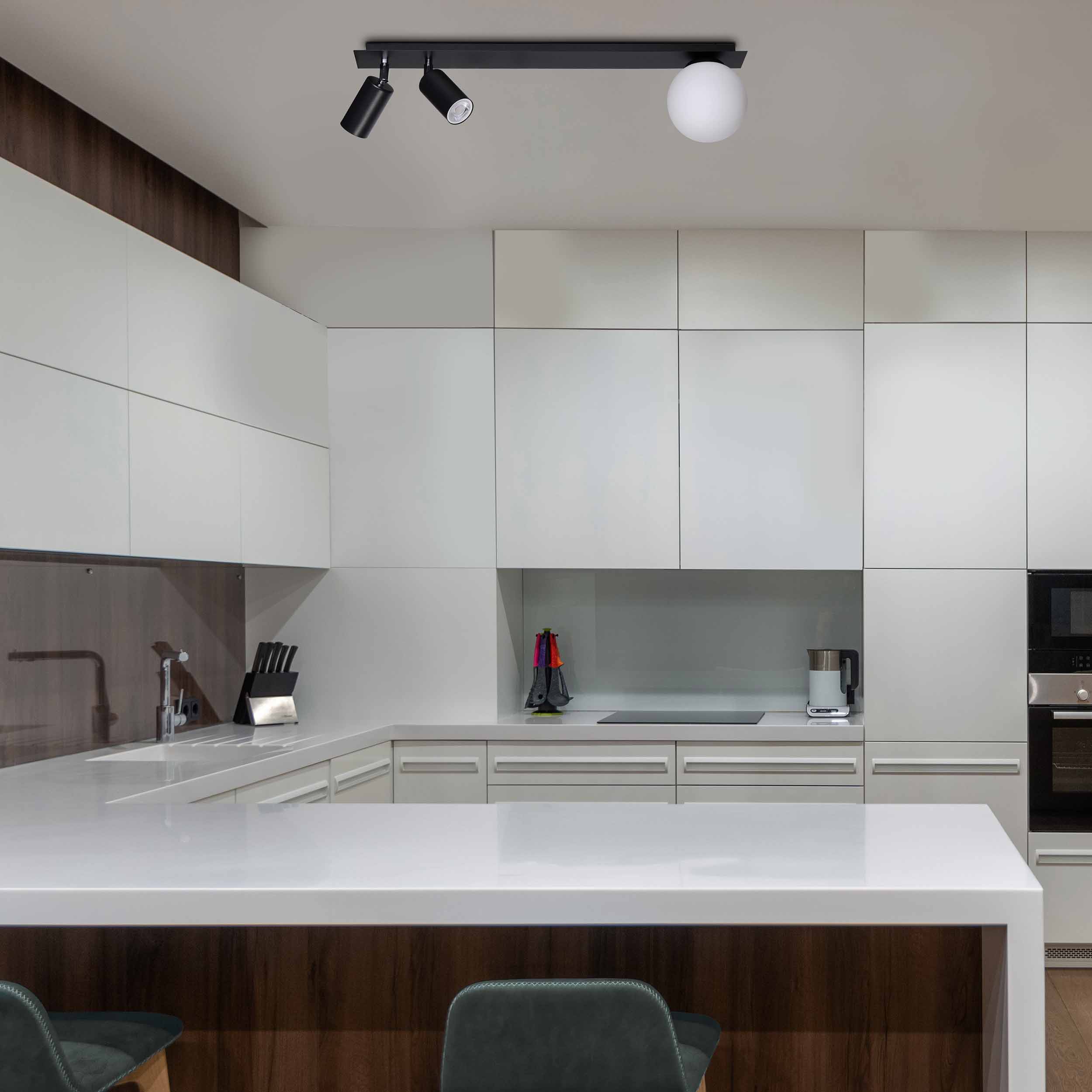 Trzy punkty światła umieściliśmy na dwóch końcach podłużnej podsufitki. Po jednej stronie mamy dwa reflektory z gwintem GU10, a po drugiej klosz z trzonkiem E14. Lampa posiada możliwość podziału na dwa włączniki (2+1).