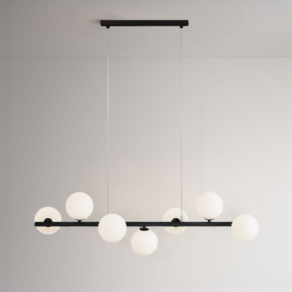 Model K-5852 wyróżnia się czarną metalową konstrukcją i białymi, szklanymi kloszami o średnicy 12 cm, co nadaje jej wyrazisty, ale wciąż elegancki wygląd. Doskonale wpisuje się w estetykę nowoczesnych, loftowych lub minimalistycznych wnętrz, gdzie detale grają pierwszoplanową rolę. Dzięki szerokości 91 cm i wysokości 100 cm, lampa świetnie prezentuje się nad dużym stołem, wyspą kuchenną czy w otwartej strefie dziennej. To nie tylko źródło światła – to element, który podkreśla styl wnętrza i nadaje mu wyrazistości.