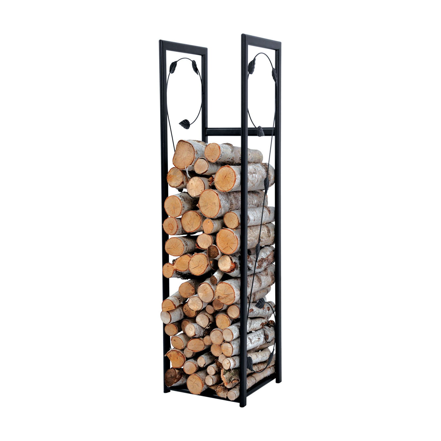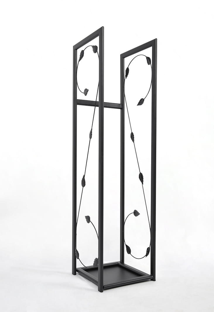Smukła konstrukcja stojaka KS-23 na bazie kwadratu o boku 30cm pozwala na ustawienie tego regału w wielu miejscach, a w szczególności we wnęce przy kominku, gdzie będzie wyjątkowo pięknie wyeksponowany. Wysokość aż 115cm umożliwia przechowywanie dużej ilości drewna, dzięki czemu nie musisz martwić się o ciągłe uzupełnianie zapasów. Jeżeli potrzebujesz mniejszego stojaka na drewno, zachęcamy do sprawdzenia innej wersji prezentowanego modelu KS-24. Zachęcamy również do sprawdzenia identycznego modelu, tylko bez roślinnego zdobienia KS-13.